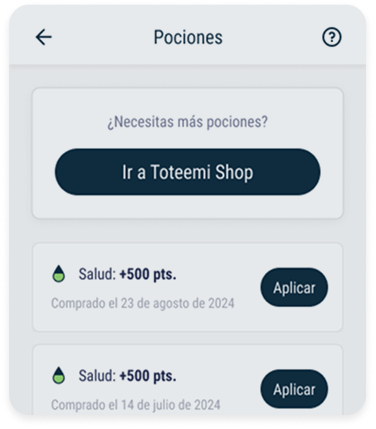 Te recomendamos tener algunas pociones en tu inventario para usarlas cuando lo necesites. Puedes comprarlas en el apartado Powerups a cambio de Teemis.