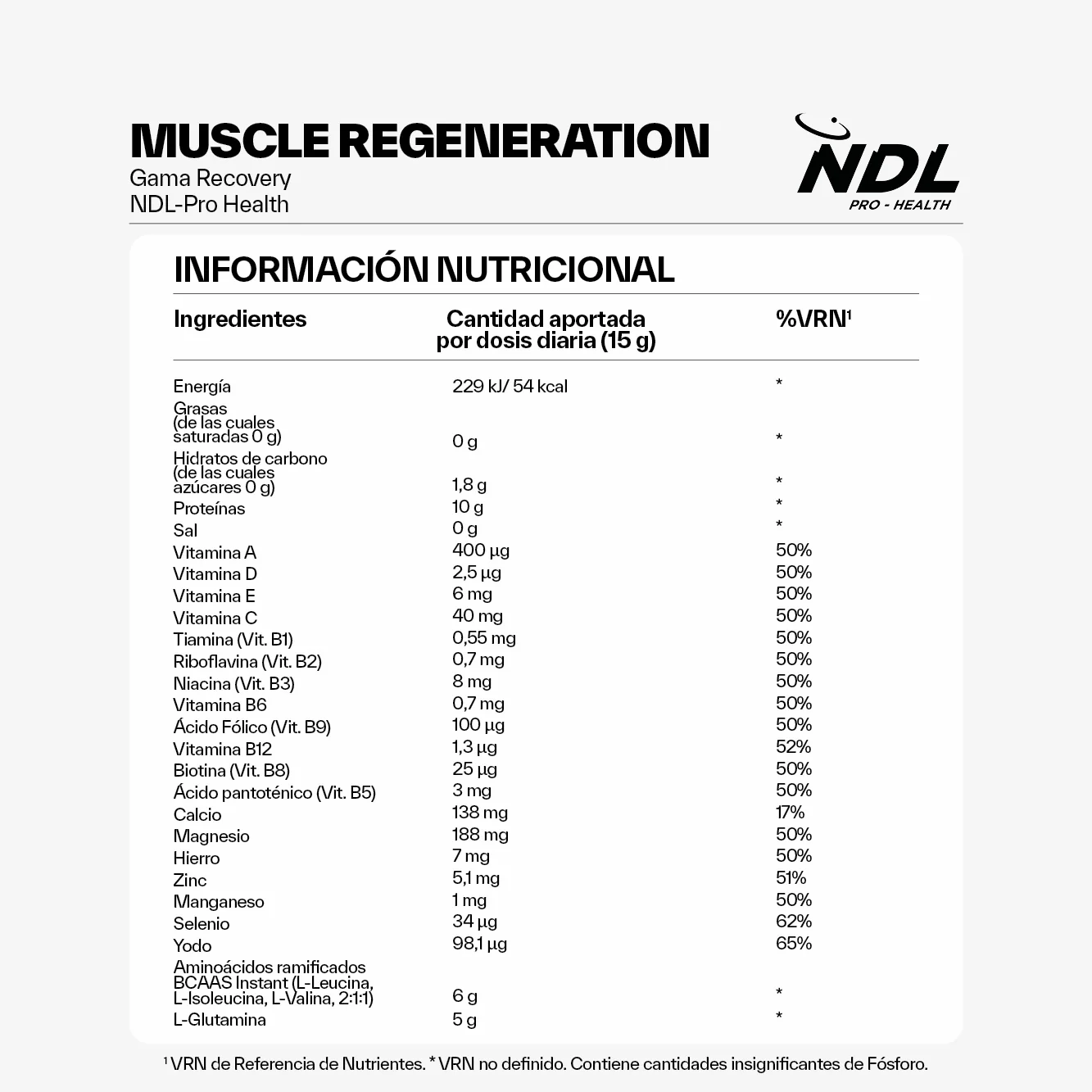 El objetivo de NDL Pro- Health Muscle Regeneration es ayudar a recuperarte después de los entrenamientos deportivos. Su fórmula está perfectamente equilibrada con aminoácidos ramificados, glutamina, minerales y vitaminas.