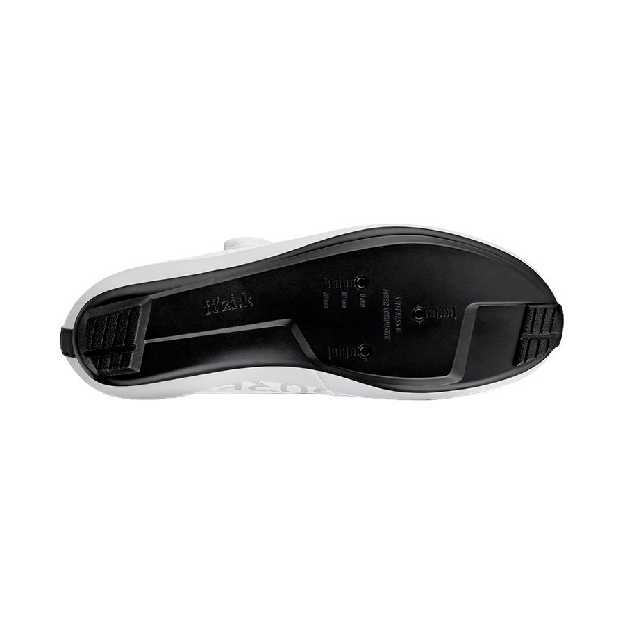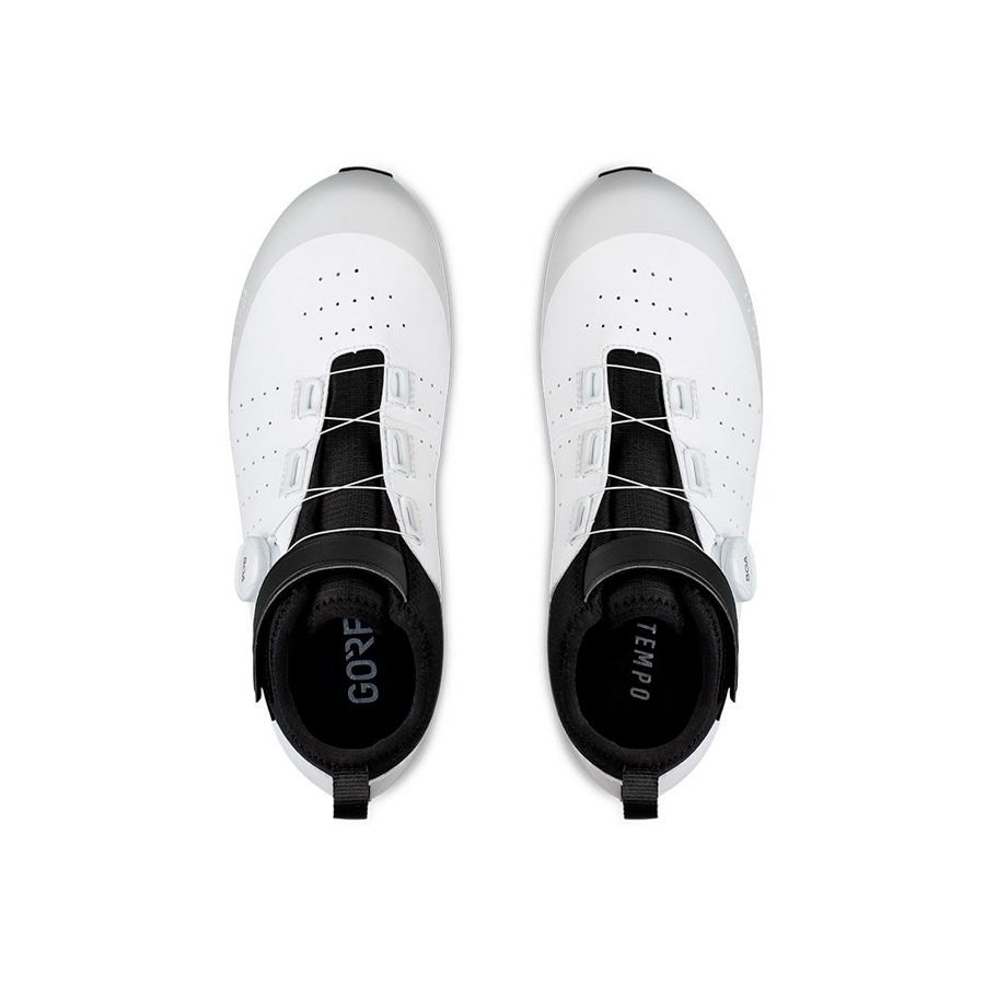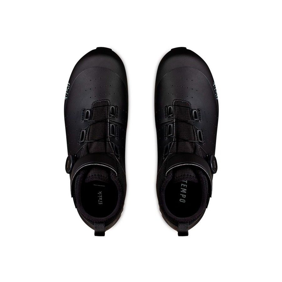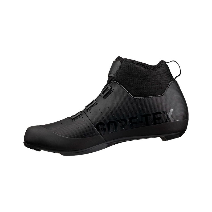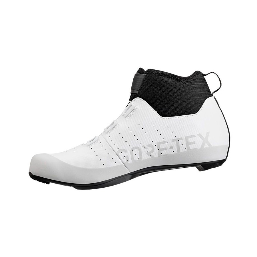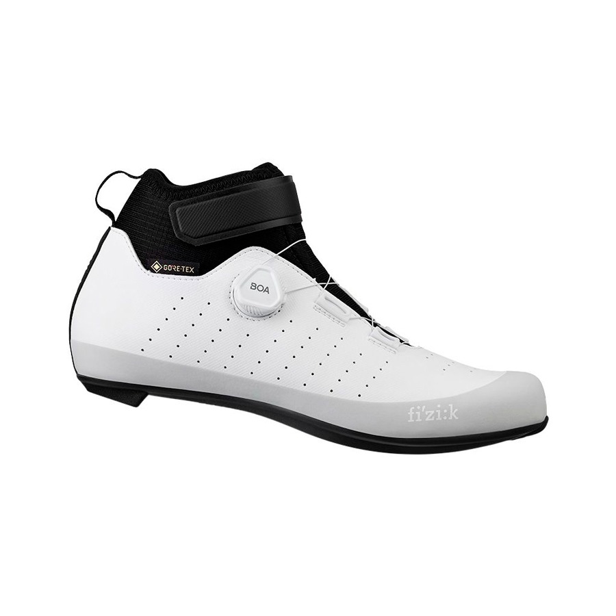 Las zapatillas Fizik Tempo Artica R5 GORE-TEX están diseñadas para las salidas de ciclismo de carretera en los días fríos e inestables. Cuentan con un forro polar interior y la avanzada membrana GORE-TEX Koala que proporciona protección impermeable y transpirabilidad para que los pies permanezcan calientes, secos y cómodos. La suela R5 ofrece comodidad y una rigidez moderada para un pedaleo eficiente. Además, la posición de la cala está ligeramente más atrás en comparación con los ajustes tradicionales para optimizar la eficiencia del pedaleo y reducir la compresión de la rodilla. En esta configuración específica para el invierno, la suela exterior omite los orificios de ventilación para mantener los pies calientes y secos. El cierre de velcro superior envuelve el tobillo alto para proporcionar una sensación de bloqueo, mientras que la sección inferior se asegura a través de un único dial BOA L6 de ajuste micrométrico.